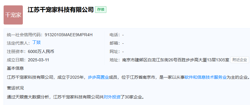 2025年3月,公开信息显示,大千生态投资设立全资子公司江苏千宠家科技有限公司,由vivo中国区原总裁丁燚担任法定代表人。该公司经营范围包括宠物销售、宠物服务(不含动物诊疗)、宠物食品及用品批发、宠物食品及用品零售等。