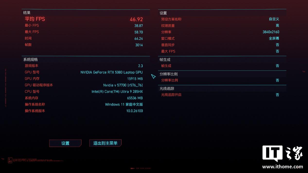 《赛博朋克:2077》对游戏本性能的挑战也非常大,即使不开启光追,只选择超级画质,4K 分辨率下游戏平均帧数也只有 46 帧,切换到 2K 分辨率后游戏平均帧数才能达到 100 帧以上。
