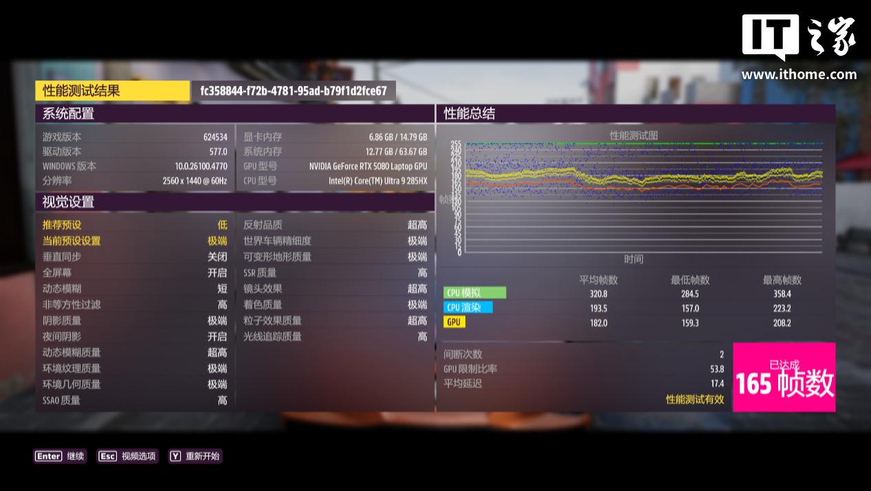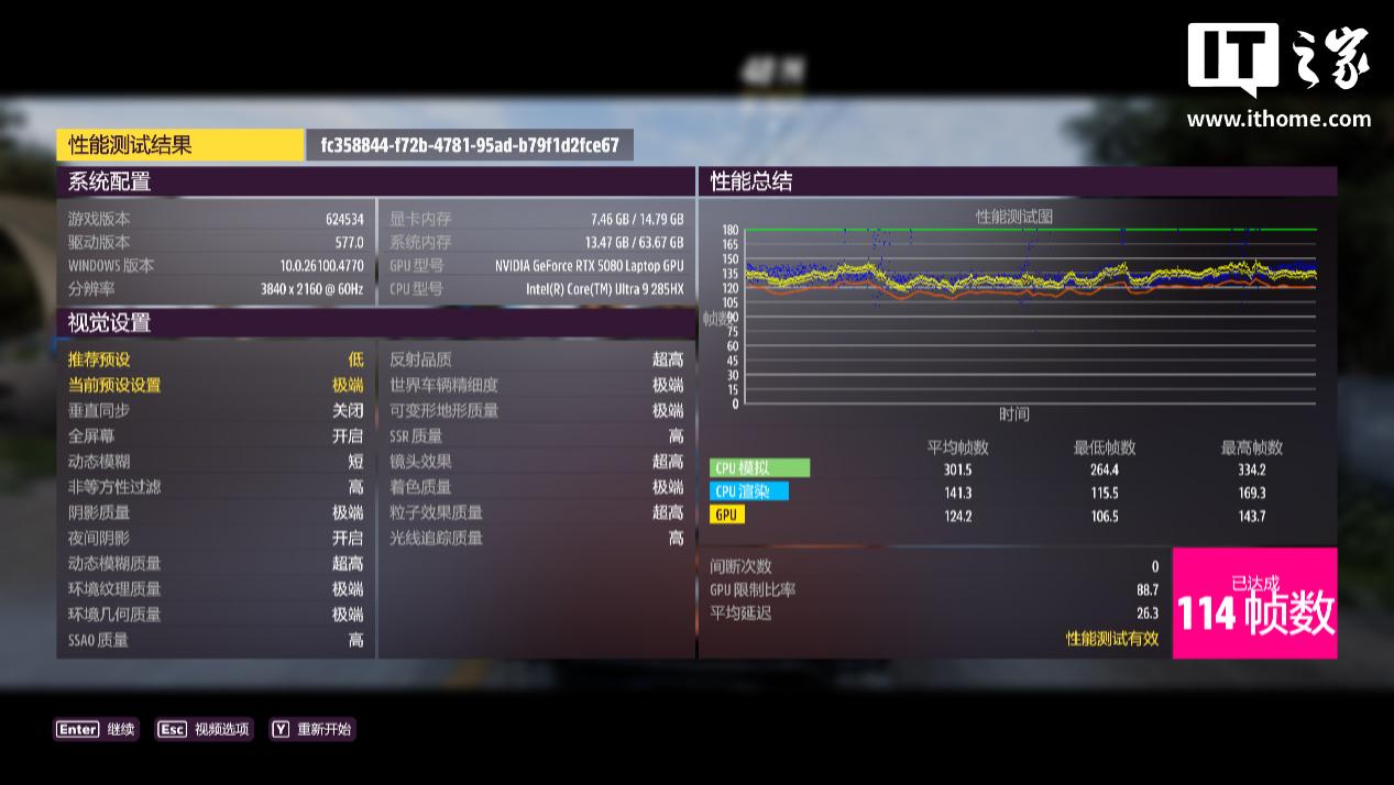 在 2K 极端画质下游戏平均帧数 165 帧,1% Low 帧 110 帧;在 4K 极端画质下游戏平均帧数 114 帧,1% Low 帧 78 帧。