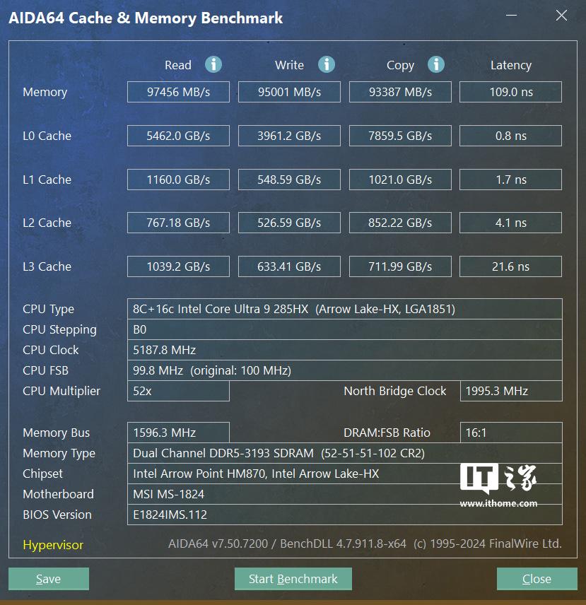 实测的内存跑分数据如图所示,读写的平均速度都在 95000MB/s 以上,拷贝速度也有 93000MB/s,内存延迟达到了 109ns 还是比较高的,当然这里面是有酷睿 Ultra 9 285HX 处理器的多 Die 设计原因所造成的影响。