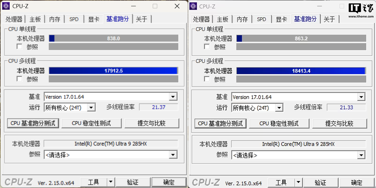 在性能测试环节,我们遇到了一个小插曲。我们发现即使开启 MSI Center 中的狂暴模式(散热加速),跑分却打不过整机功耗更低的微星泰坦 18 Pro AI 2025,而且还不是几十分的差距。比如在 CPU-Z 的跑分上,单核跑分低了 25 分,性能下降了 2.8%;多核跑分少了 501 分,性能下降了 2.7%。