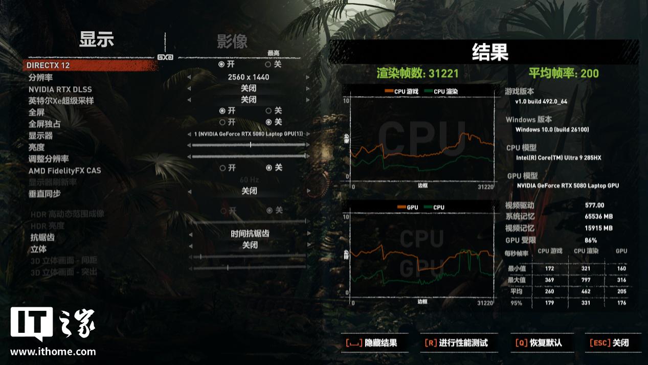 在 2K 高画质下游戏平均帧数 371 帧,1% Low 帧 166 帧;在 4K 高画质下游戏平均帧数 226 帧,1% Low 帧 144 帧。