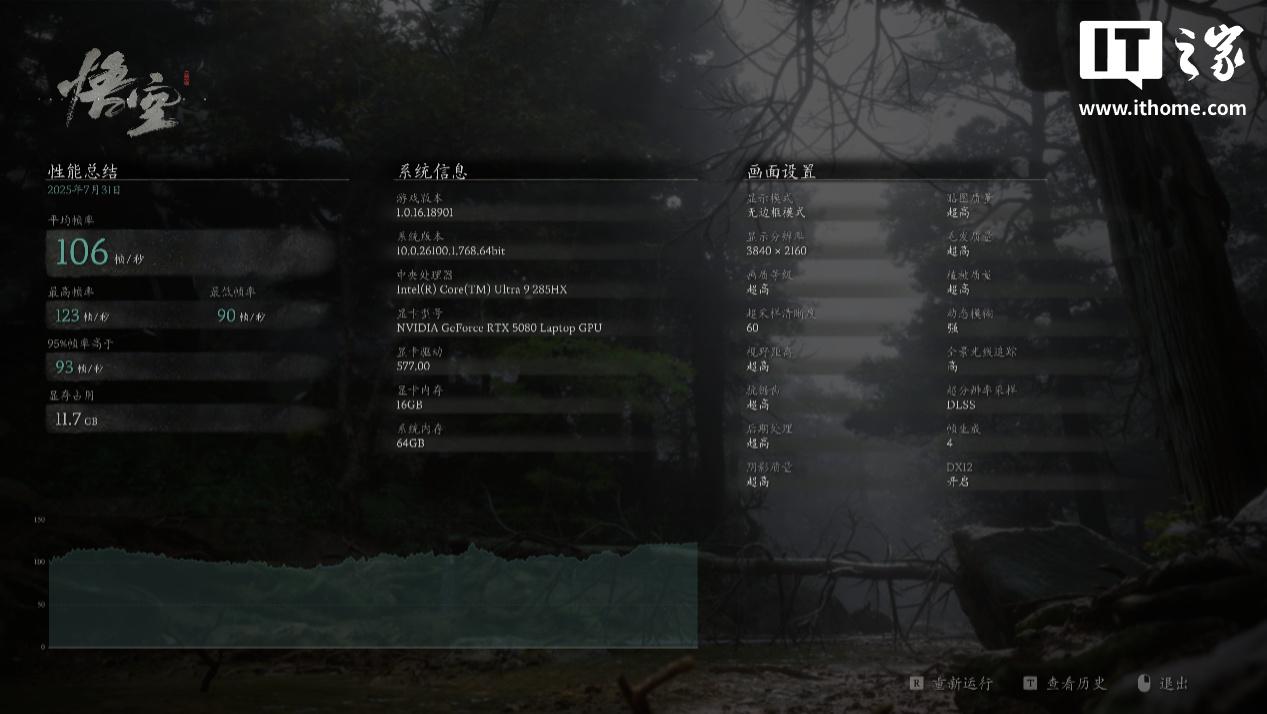 在 4K 分辨率下 + DLSS 60% 超采样 + 超高画质设置下,开启 2x 和 4x 多帧生成,游戏平均分数分别达到了 60 帧和 106 帧。