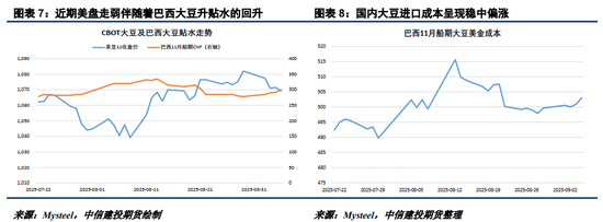 因8月底李成刚赴美谈判未在关税及美豆采购上取得进展,本周CBOT大豆因上市压力及需求担忧再度走低,然而,南美大豆升贴水的相应走升并未带来国内大豆进口成本的显著下移,这令国内豆类市场受到的成本端支撑依然较强,导致本周连盘豆类并未受到美盘走低的太多拖累。