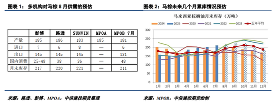 国内消费大幅增长,以及马棕7月产量同比表现转弱,令马棕在6-7月遭遇连续的累库放缓,我们预计此种状态还将在8月延续。随着去年下半年劳动力改善的影响减退,叠加前期马来半岛降雨偏差,马棕7月产量已出现1.6%的同比降幅,多机构预估暗示马棕8月产量环比可能仅增2%左右,对应同比降幅在2.4%左右。出口方面,印棕8月的提税令其对马棕出口挤占减少,叠加印度植物油补库需求仍存,这令马棕8月出口环比增长明显。按此节奏推算,随着马棕产量在9-10月达峰,留给马棕的累库时间及空间已经不多了。