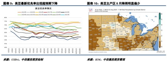 在USDA作物生长报告显示截至8月31日的美豆优良率意外下降至65%,且StoneX率先在最新报告中将美豆新作单产预估从53.6调降至53.2蒲式耳/英亩后,美豆的单产炒作情绪有所升温。越来越多的人开始关注到美豆主产区8月以来降雨持续偏低的问题,对美豆的鼓粒及粒重的担忧有所增多,我们预计USDA后期调降美豆单产预估的可能性将显著增加,这或导致2025/26年度美豆结转库存的进一步收紧。