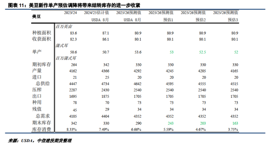 不考虑未来中国随时可能重启的美豆采购对出口的潜在提振,美豆新作单产调降至52.5将导致其结转库存向2亿蒲迈进,低于52.5的单产则将对应2亿蒲以下的期末库存水平,这预计将令CBOT大豆修复种植成本的驱动相应增长。短期需关注USDA 9月报告对单产的调整,因9月单产预估为今年首次基于实地调研的预估,其结果可能较8月有较大变化,需警惕单产调降超预期的可能性。若CBOT大豆获得企稳回升,且南美大豆升贴水仍受到中国需求的支撑,预计国内大豆进口成本将面临抬升,这也将相应抬升连盘豆类估值。